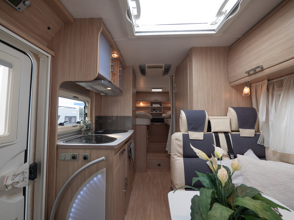 Hier treft u een TEC Rotec I 680 uit 2008 aan – een goed geplande en comfortabele camper die functionaliteit en comfort uitstekend combineert. Gebouwd op een betrouwbare Fiat basis met handgeschakelde versnellingsbak en distributieketting, biedt het een veilige en soepele rit. De woonkamer beschikt over een ruime en lichte indeling met een hoekbank, omkeerbare stoelen en een praktische, rechte keuken met een 3-pits fornuis, koelkast, vriesvak en veel opbergruimte. Ideaal voor zowel een snelle koffiepauze als langere kooksessies. Het slaapgedeelte bestaat uit hoge, lange bedden met schermen en een handmatig uitklapbaar dakbed, dat indien nodig extra slaapruimte biedt. Als u op zoek bent naar extra ruime bagageruimte, dan zult u de grote garage waarderen, ideaal voor zowel vakantie-uitrusting als vrijetijdsuitrusting. Voor mooie dagen is er zowel een luifel als een fietsenrek aanwezig. Eenmaal binnen in de camper geniet u van verkoeling dankzij de airconditioning in de leefruimte en de vloerverwarming op waterbasis voor koude nachten. Met handmatige steunpoten staat de auto stabiel op zijn plaats, ongeacht de ondergrond. Een camper die zowel geschikt is voor een stel dat ruimte wenst als voor een gezin dat behoefte heeft aan slimme oplossingen.